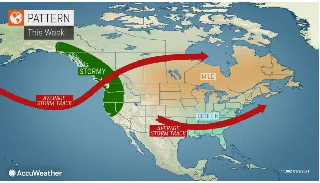 “This pattern will help to push storm systems farther south. So while much of the northern Plains into the Great Lakes remains drier and milder, the southern Plains and Southeast will still be relatively cool and more active.”