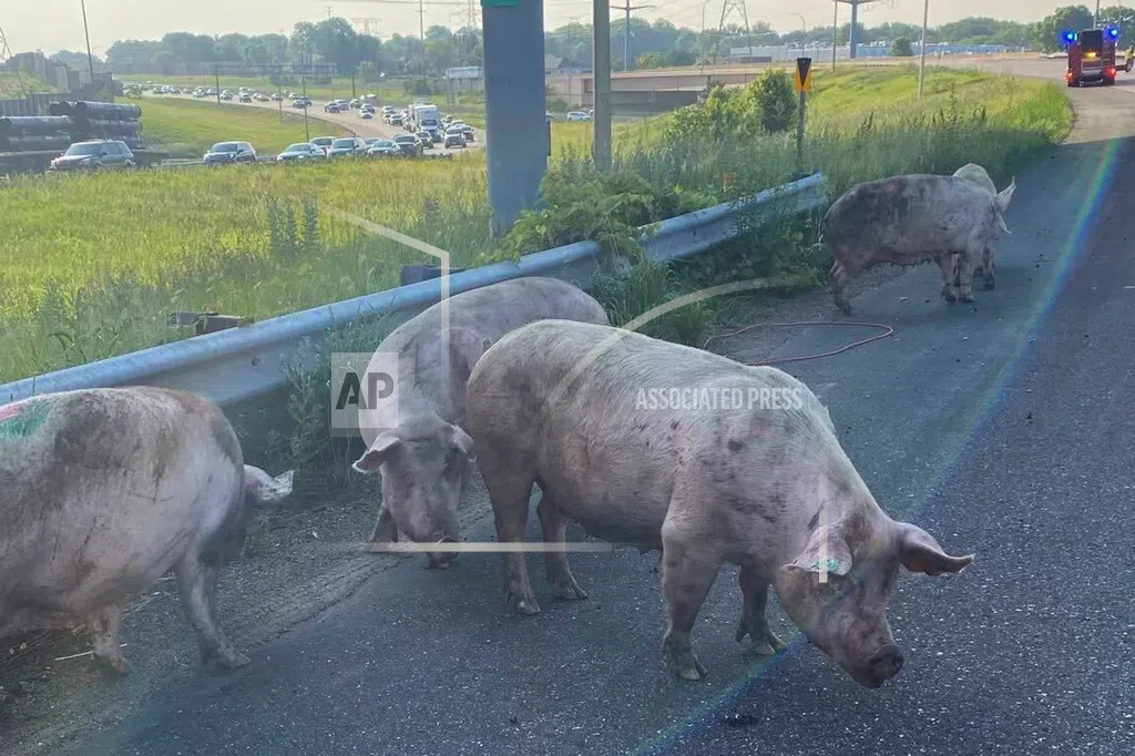 This photo provided by the Minnesota State Patrol shows pigs running loose on a metro highway after a semitrailer truck that was carrying them overturned, causing an hours-long shutdown Friday morning, June 9, 2023, in Little Canada, Minn. (Minnesota State Patrol via AP)