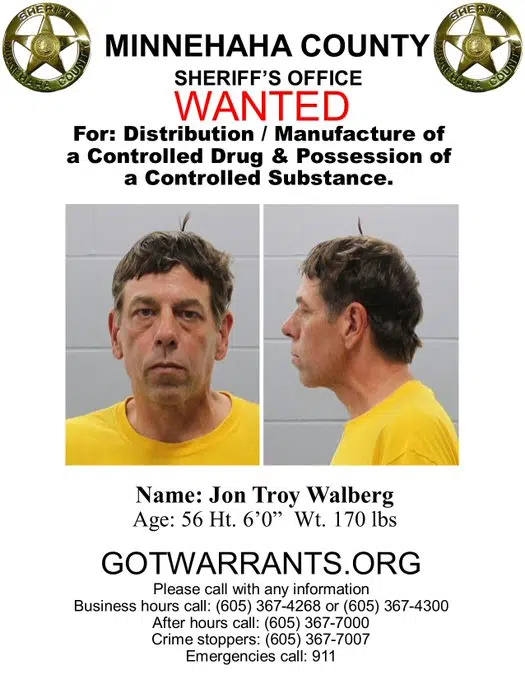 SIOUX FALLS, SD (KELO.com) — The Minnehaha County Sheriff’s office is asking for help in finding Jon Walberg on drug charges. He is wanted for distributing and manufacturing drugs, and possession of a controlled substance.